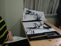 Then we had lunch. I've included a photo for my brother of the chopsticks. This is from breakfast, hence the sausages. Between my first and second lecture I walked back to my dorm and slipped on the ice and changed my pants. Then after lunch I found that I had a strange red stain on my pants and my sweater. So in my second coat and third pair of pants I went to my fourth lecture. It was traditional Korean painting. They gave us very little instructions before we were told to start. We each got to make two paintings and received one that was made by the instructor.